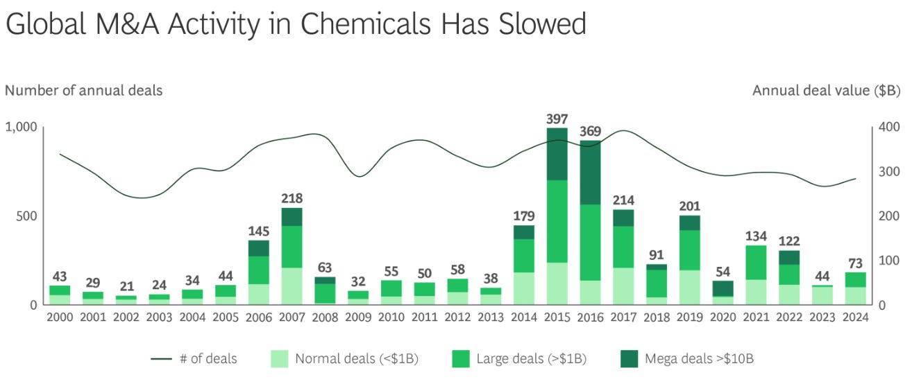 Private equity returns over the last few years have also been lackluster. This underperformance to the broader stock market could have been impacting the overall global M&A in chemicals.